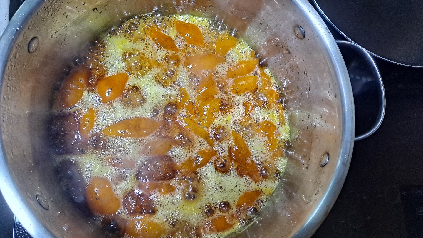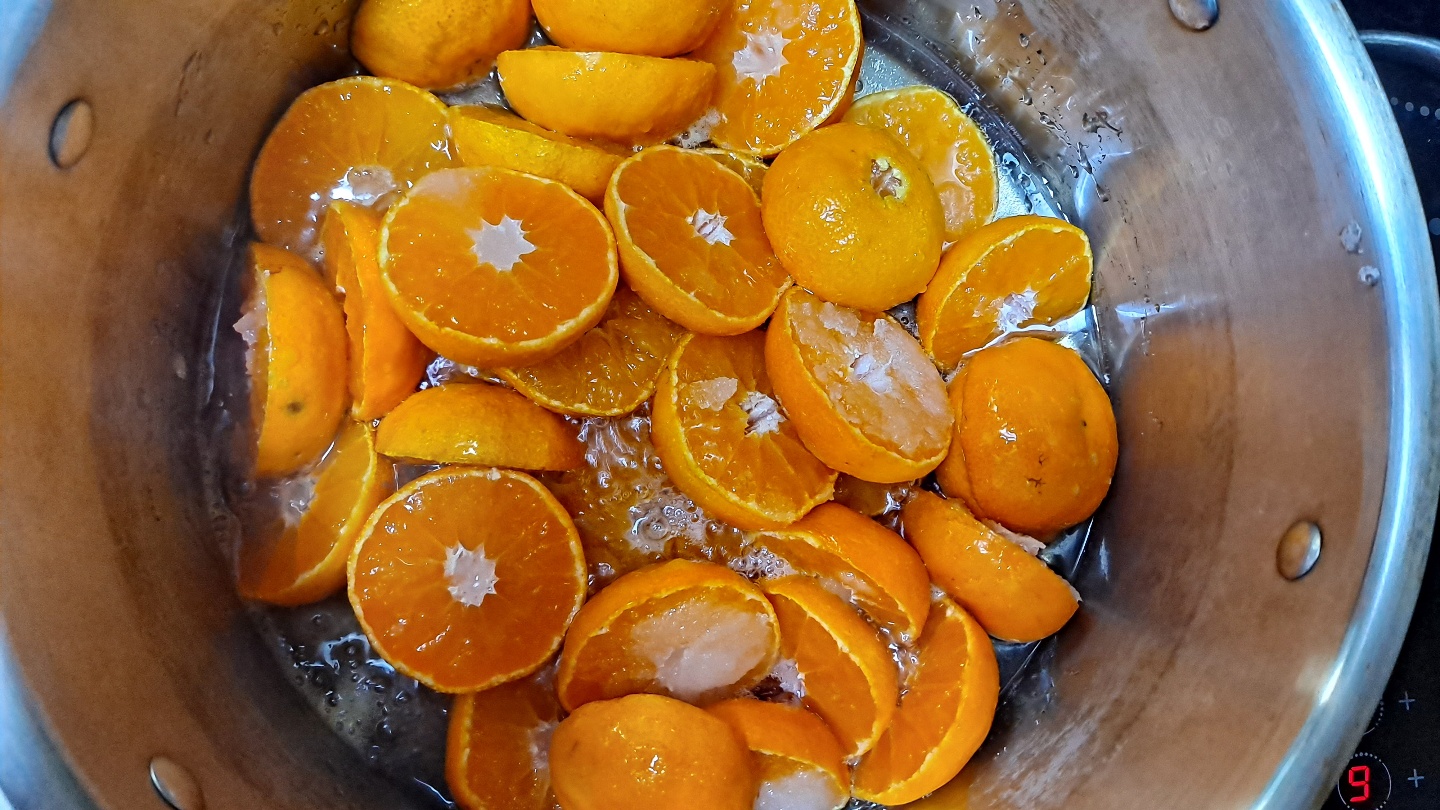 12.냄비에 물엿 커피잔컵으로 1컵을 부어 끓기 시작하면 당침 해놨던 귤과 귤즙을 넣어