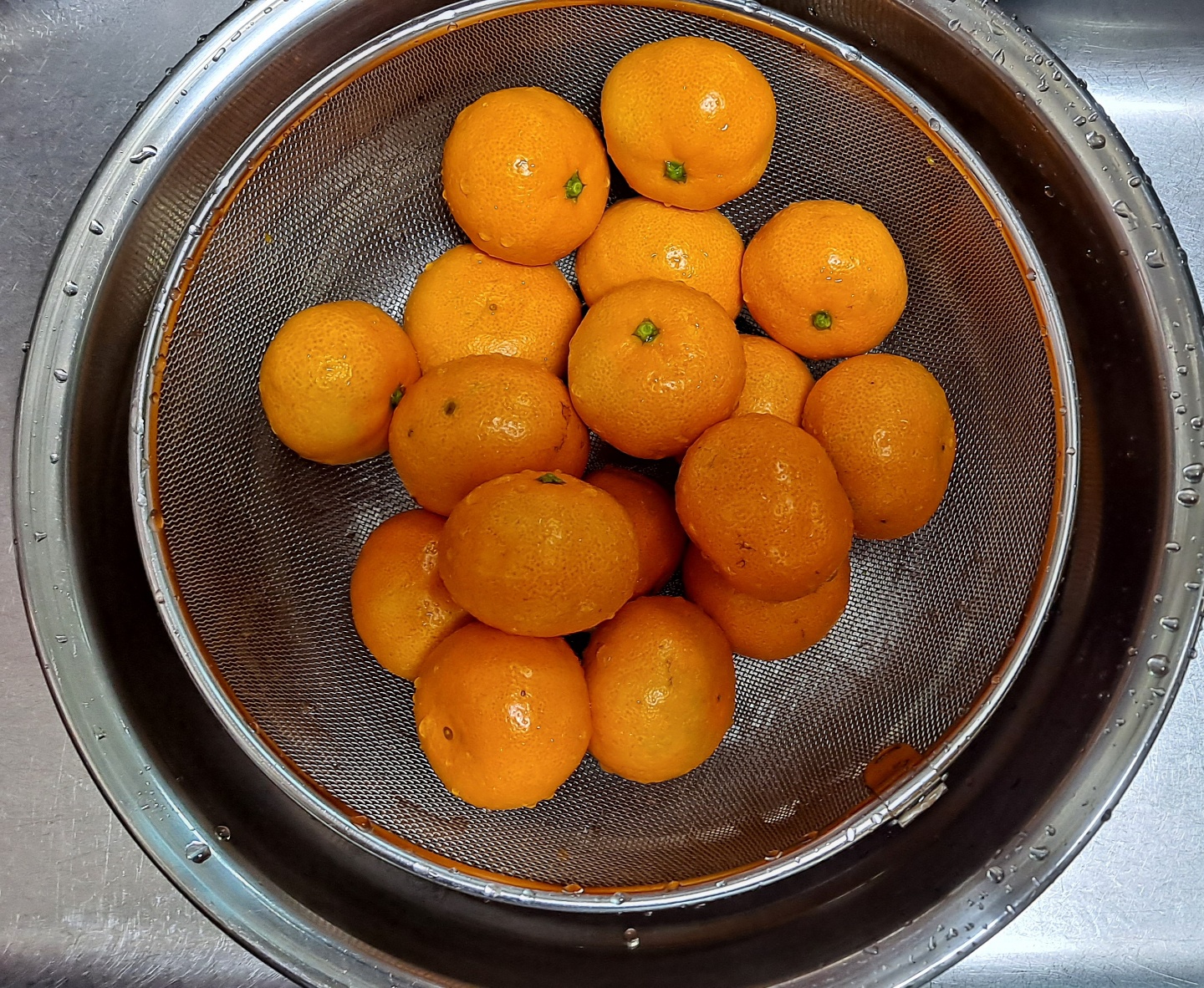 4.20분 경과된 귤을 깨끗하게 닦아 헹구어낸후 소쿠리에 건져놓습니다.