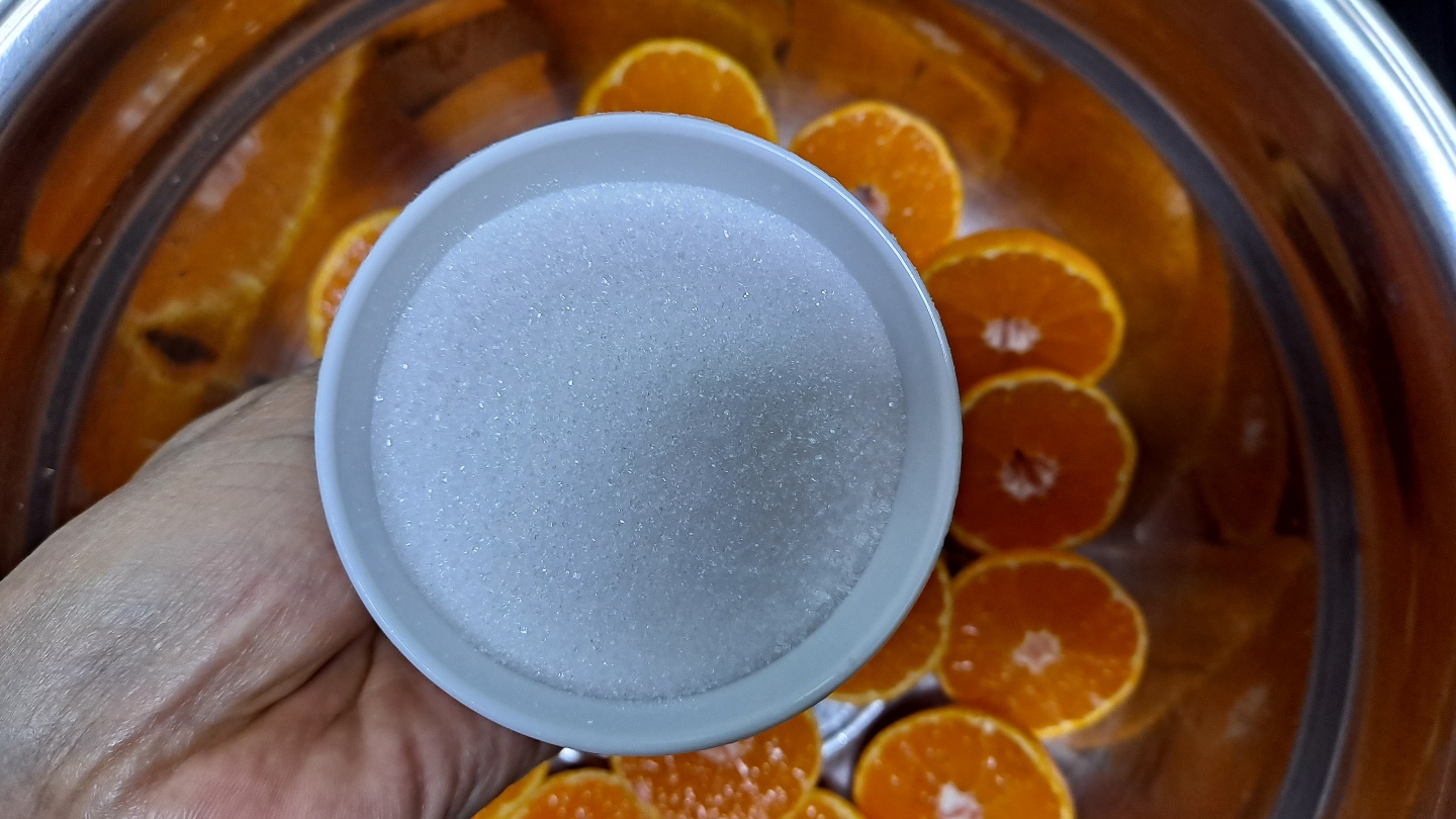 귤 16개,베이킹파우더 소주잔으로 1컵,식초 소주잔 1컵,백설탕 종이컵 2잔,물엿 종이컵 1잔