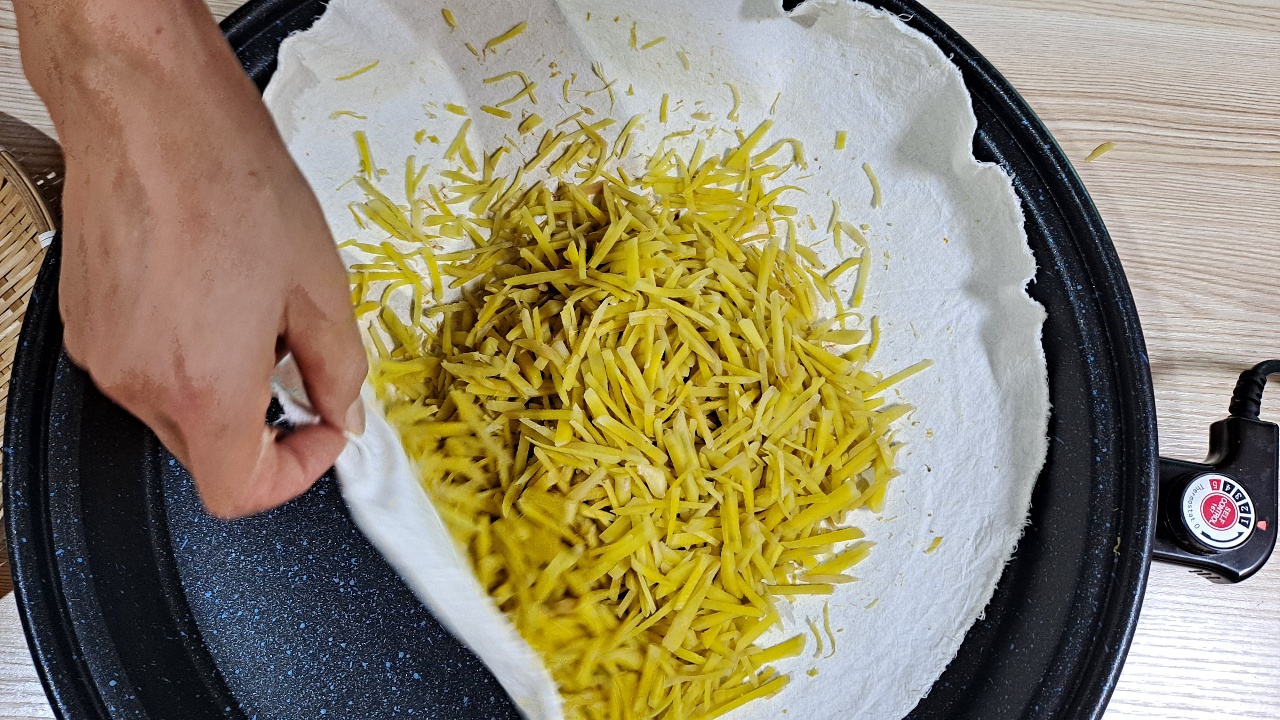 12.생강이 잘 덖어 건조상태가 느껴지면 찜기위 면보위 생강을 올려 뚜껑을 덮고