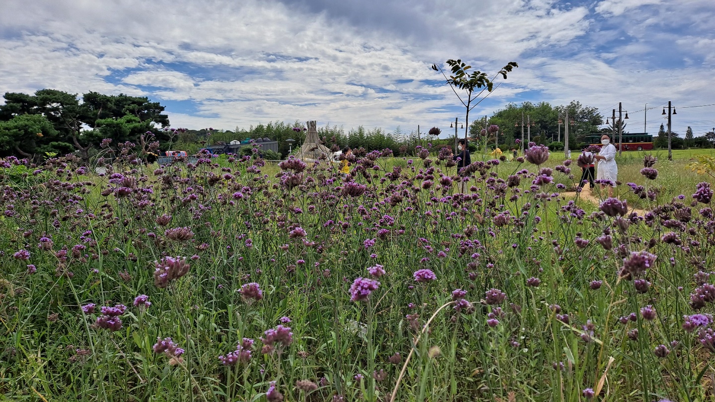 "버들마편초"꽃밭이 있고, 대형버스가 보이는데요~